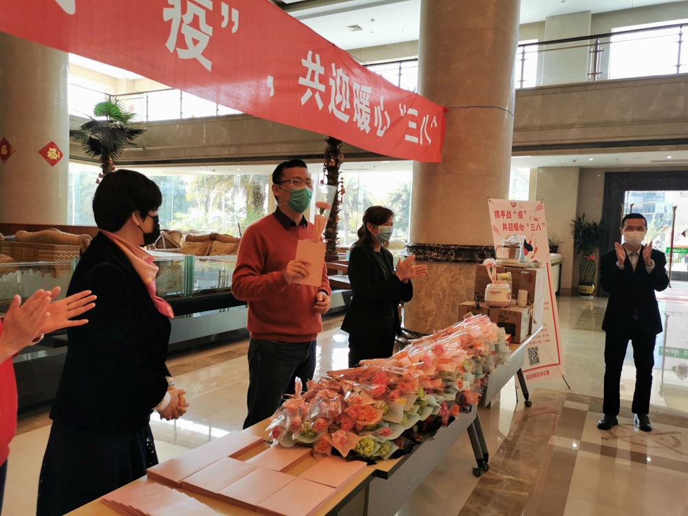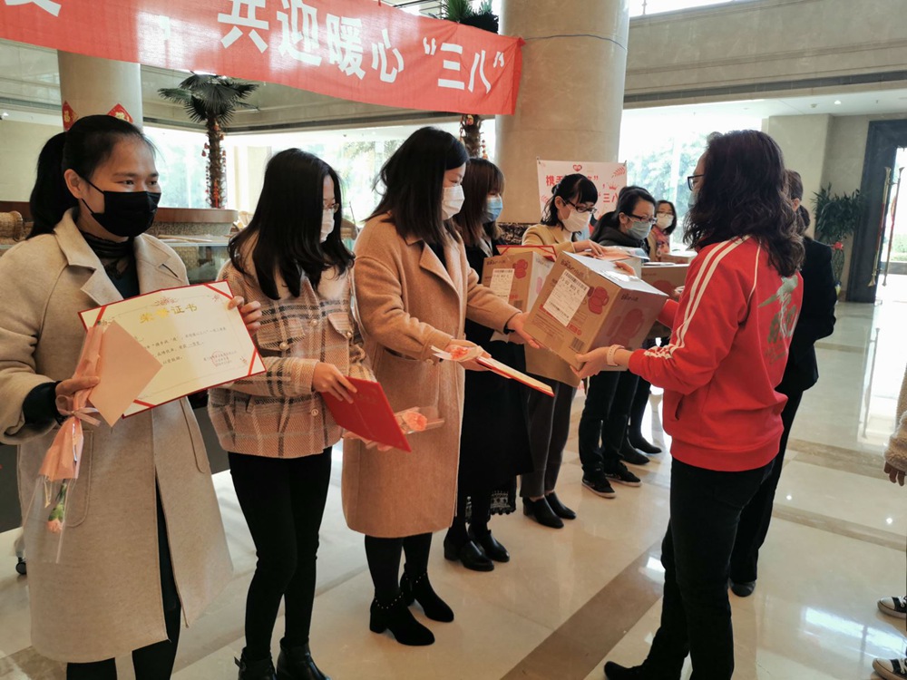 隨后總裁兼CEO孫亦農先生、首席財務官裴紅蘭女士、首席營銷官紀偉如女士、內審中心副總、銀鷺食品黨支部書記林麗霜女士為獲得一等獎的職工們送上鮮花、禮品。儀式簡單而溫馨,雖然大家都戴著口罩,但口罩擋不住她們的美麗,面對疫情,我們云擁抱、云互動,祝福是遠程的,心卻是如此貼近,這個3.8節(jié)過得比往年更有意義。