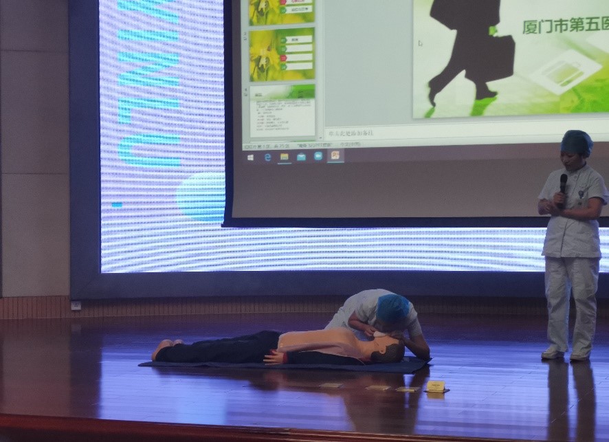講座現(xiàn)場, 張護(hù)士長及其團(tuán)隊的優(yōu)秀護(hù)士們攜帶了人體模型,認(rèn)真演示了人工呼吸、心肺復(fù)蘇急救法的動作規(guī)范,通過情景互動方式,讓員工了解如何判斷現(xiàn)場環(huán)境是否安全,通過角色扮演加強印象,讓每個人有練習(xí)的機會。
